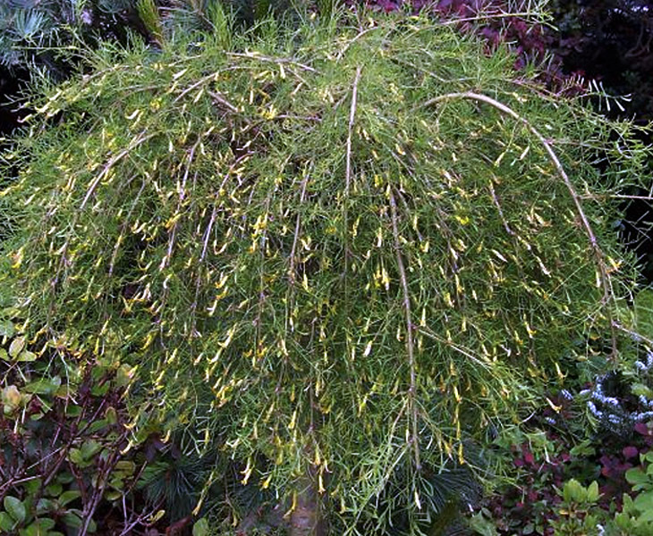An original plant with an openwork crown, the narrow leaves of which resemble larch needles. This variety is distinguished by rapid growth, the shrub can reach a height of 3.5 m. For its unusual appearance, the plant is called the "northern palm". The buds are smaller than that of the classic species, but the flowering is more generous.