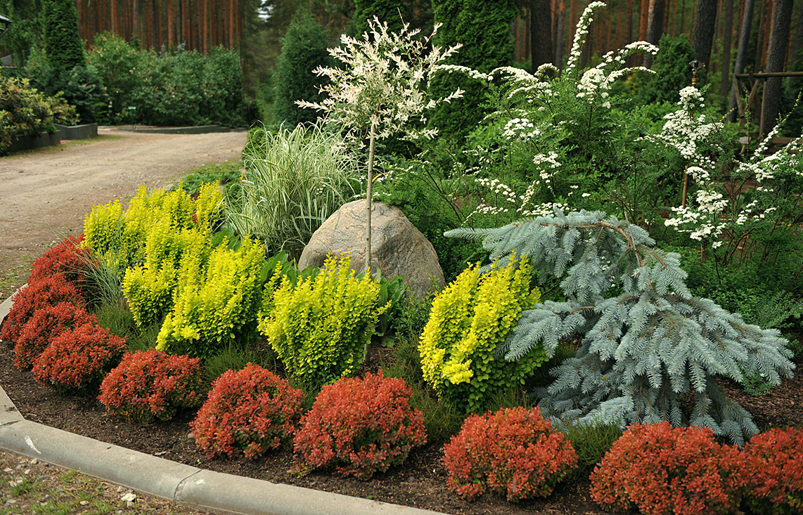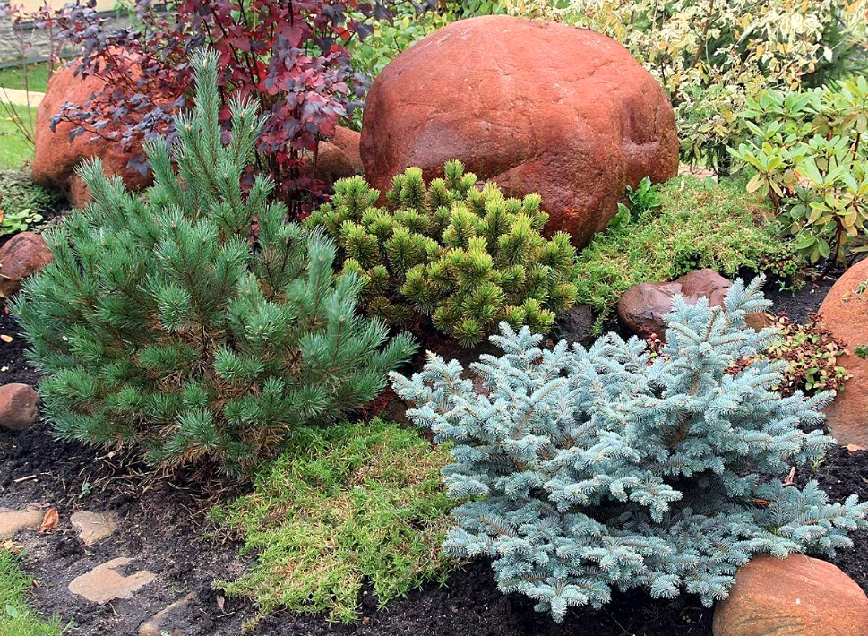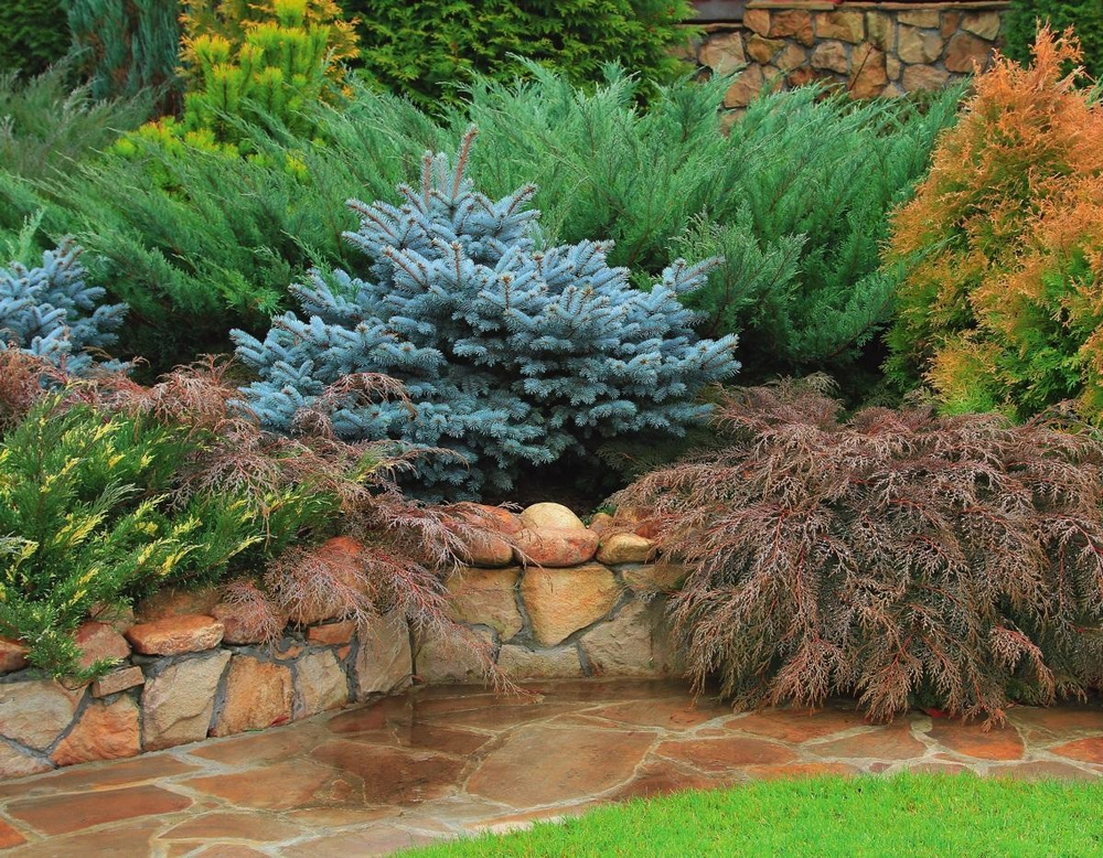 Dwarf Christmas trees are very effective in contrasting landscape compositions, where conifers and deciduous plants with different foliage colors are well combined. Plants with yellow, orange and pale green foliage, which stand out brightly against the background of dark needles (barberry, spirea, maple, thuja, juniper), are especially beautiful.
