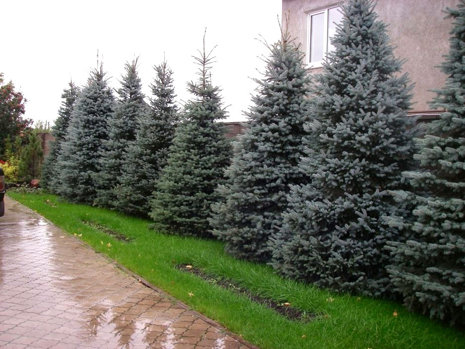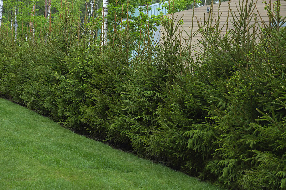 Spruce tolerates pruning well, which allows you to create spectacular hedges or whole green walls. Fir-trees with contrasting needles will look beautiful, for example, ordinary spruce with a dark green crown and spiny spruce Hoopsii of a rich silver-blue hue. In addition, such thorny hedges, planted around the perimeter of the site, will eventually turn into reliable, irresistible guards.