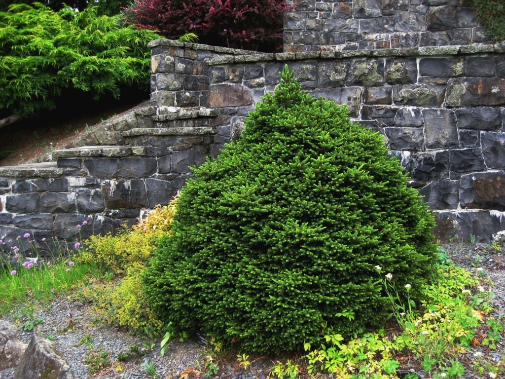 In curbs and ridges, low-growing spruces also found their use, combined with other evergreens and bright flowers.The slow-growing Tompa spruce is perfect for long-term landscape projects, and the dwarf Nidiformis with light green spherical needles is very effective in group plantings.