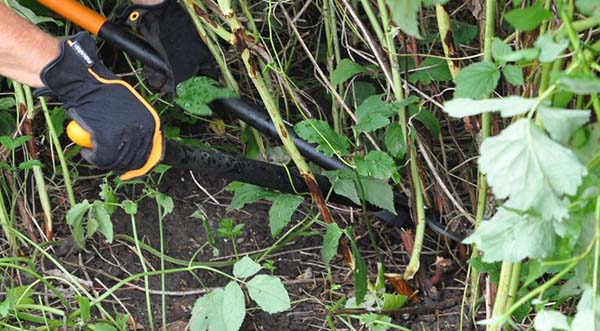 - In September, it is necessary to bury a shovel near bad bushes to the full depth at a slight angle to the bush. This operation should be done around the entire bush;