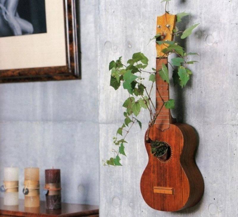 The strings are removed from the old guitar, the back deck is carefully removed. A wall pot is glued to the inner cavity with the flat side, and the stem is picturesquely brought out through the resonator hole.