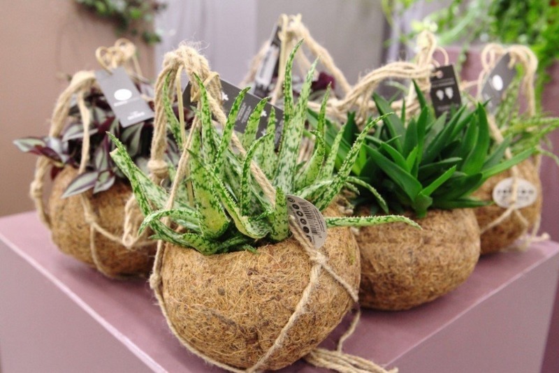 Coconut shells are used for many crafts. A pots made of this strong peel, suspended on a fleecy jute twine, look very colorful.