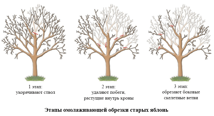 A feature of repeated anti-aging procedures is the removal of branches that have formed on the tree over the past three years. Each such branch is pruned to a viable second-order branch, which later replaces the deleted one. All the strongest branches are pruned in this way. As a result, an active renewal of the crown occurs, which is accompanied by an improvement in the quality of the fruits (apples ripen less, but they become larger).