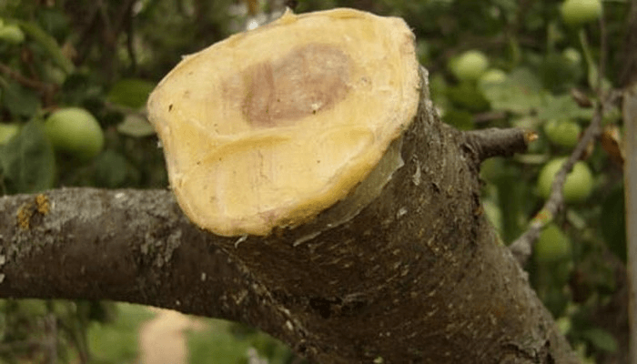 Apple trees that are pruned in the fall require special care. The sections formed after the excision of the branches must be treated with oil paint, garden varnish or a mixture of vitriol and lime. This will prevent harmful bacteria from infecting the wound.