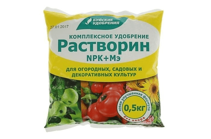 | Novofert | Water-soluble fertilizer that promotes plant adaptation to adverse external factors | Once. Top dressing by leaves or under the root is carried out at the rate of 10 g of the drug per bucket of water |