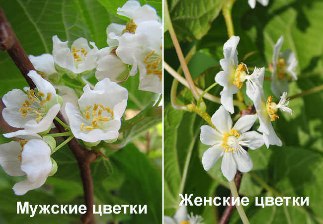 It is guaranteed to determine the sex of the actinidia colomict only after the beginning of flowering. Female flowers have a pistil, which grows into an ovary after pollination, while male flowers have only stamens.