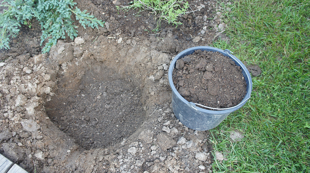 - The pit is filled with a third of the volume of the prepared soil mixture, watered and waited for moisture to be absorbed.