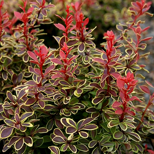 - The red-orange leaves of the Thunberg barberry are bordered with a yellow stripe