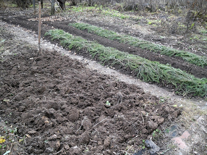 - Protect crops from snowless frosts and rodents with mulch (peat, humus) and cover with coniferous spruce branches.