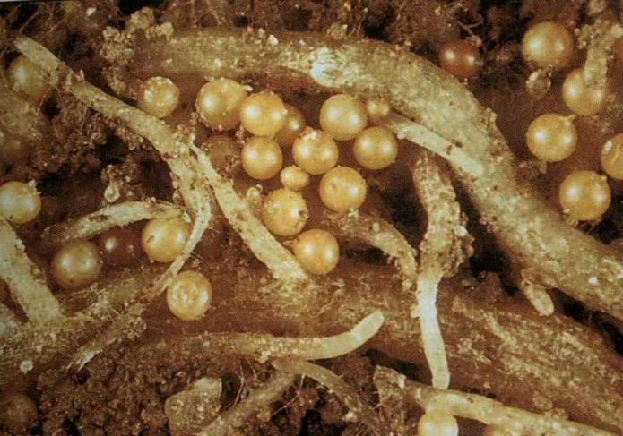 - Nematode. Pests lay eggs in the tissues of the plant roots. They become covered with spherical growths of different sizes, turn black. The hawthorn bush stops developing, as it does not receive sufficient nutrition. For prophylaxis in early spring, the soil in the trunk circle is watered with hot (45–50 ° C) water or infusion of chicken manure diluted with water 1:12. During digging, wood ash and onion husks are introduced into the soil. To combat the nematode, drugs Nemabakt, Heterofos are used.