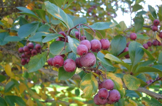 - Slatey. The height of the tree is up to 7 m. The crown is very dense, slightly asymmetrical. The side shoots are slightly numb, so it looks like a tent. The fruits are bright scarlet, round, the yield is very high. A popular breeding hybrid is Splendens, it looks very decorative in autumn. The leaves change color to a rich orange, glossy scarlet fruits do not fall off for a long time.