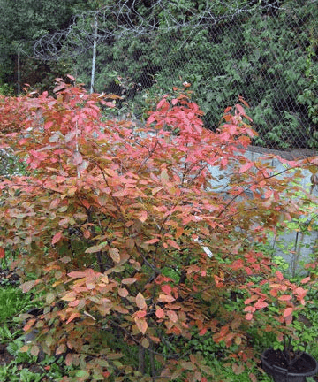The plant reaches 2.5–3 m in height, bushy, with a wide spreading crown. Erect shoots, olive-gray bark. Egg-shaped leaves with a serrated edge. The average length of the leaves is 3.5–4 cm, width is about 2.5 cm. In autumn, they change color from dark green to scarlet or crimson, in the sun they shine golden.