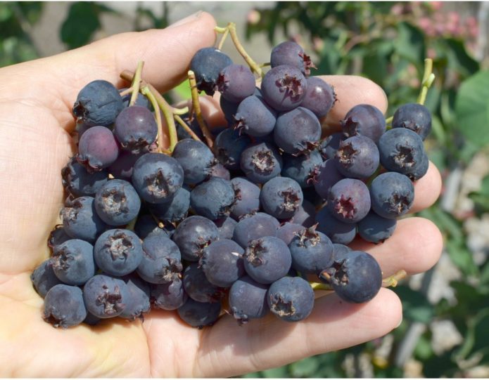Yergi harvest - round-shaped berries with a diameter of about 0.8 cm. Depending on the variety, they can be flattened or elongated. Unripe fruits are colored bright pink, which gradually changes to purple, inky purple and almost black. Ripening does not occur simultaneously, therefore, fruits of all possible shades can be observed on the branch at the same time. The skin of ripe berries is covered with a bluish-gray bloom. The crop is harvested early, fruiting begins at the end of June and lasts for several weeks.
