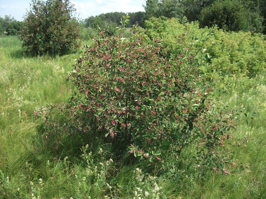 - irga blood-red (sanguinea). Shrub or semi-shrub 3–3.5 m high. The crown is spreading, its diameter almost coincides with the height. It blooms towards the end of May, the harvest ripens in mid-August. It does not breed very readily. Berries with dark scarlet skin are slightly flattened. Their taste is not very pleasant, there are a lot of seeds in a very dense, as if "rubber" pulp. Even birds do not eat these fruits. But they make a delicious juice, especially if you mix it with currant, apple.