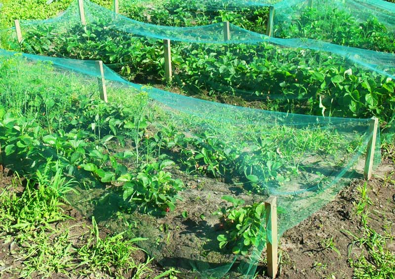 - The planting of strawberries is covered with a net, which is fixed on pegs driven along the perimeter of the site.
