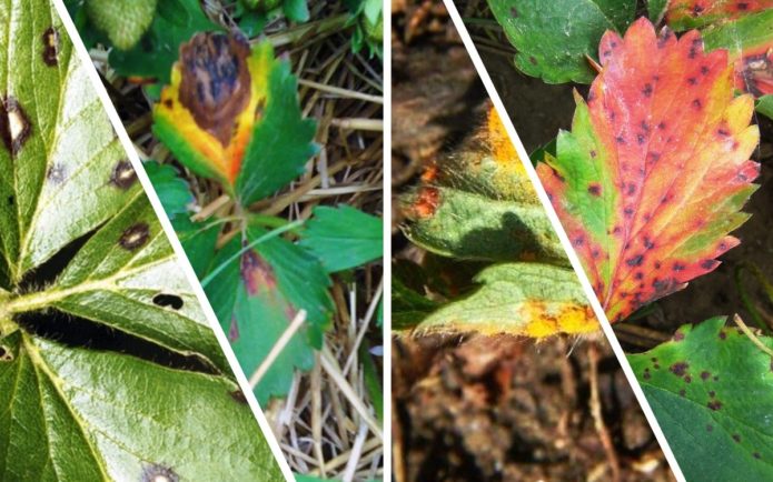 - When the leaves of the strawberry are covered with spots, ahead of time they begin to change color from green to yellow, red, brown or black, this is a clear sign that the plant urgently needs your help.