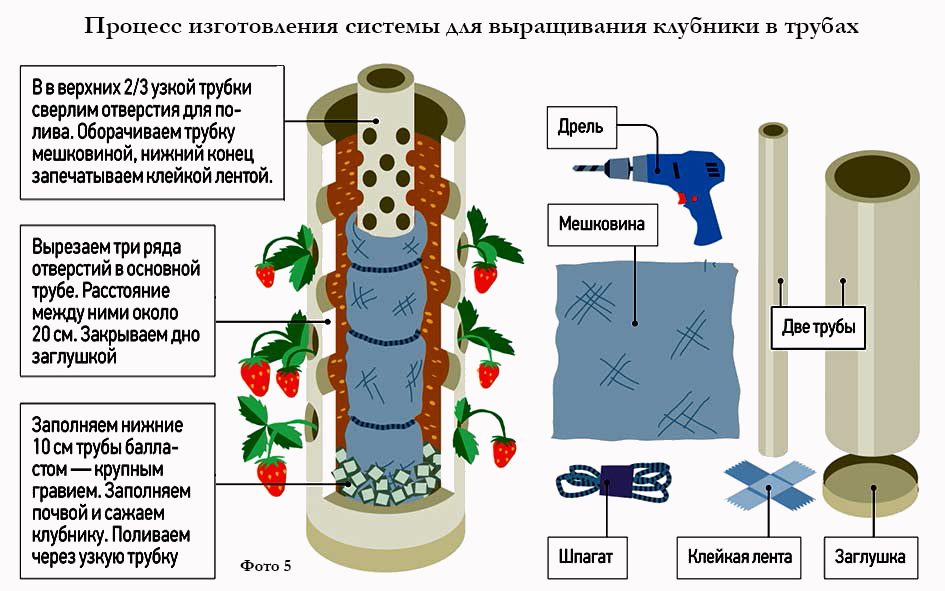 But the most unusual planting method is vertical PVC pipes. To implement this method, you should take PVC pipes and at the same distance (about 20 cm) drill holes in them with a diameter of no more than 15 cm, and close the bottom of the pipe with a plug. Next, we prepare a rigid hose, in which we also make holes of only a small size and wrap this structure in burlap, tightly fixing it with twine. We place the wrapped hose in the previously prepared pipe. First, we fill the pipe with coarse gravel or crushed stone, then we load the soil substrate (black soil - 60%, high-moor peat -25% and perlite, you can use sand - 15%).