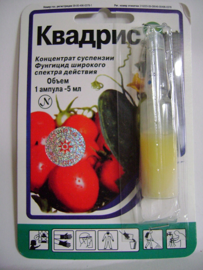 | Quadris | 5 ml for 10 liters of water. Often used in combination with other fungicides. | The azoxystrobin contained in the drug stops the supply of oxygen to the spores of the fungi - the fungus dies. |