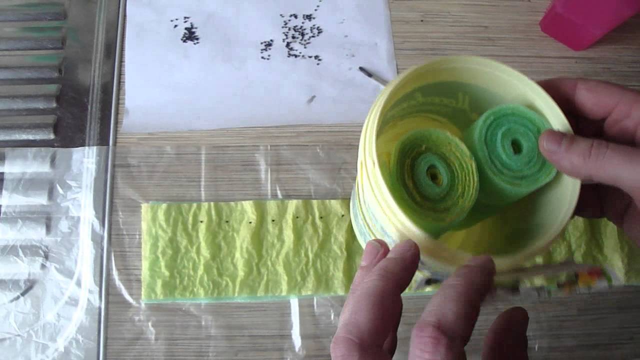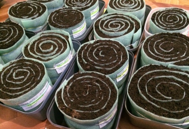 A strip 10-12 cm wide is cut out of the film, laid out on the table and 3-4 layers of toilet paper are laid on top. Her moistened abundantly and seeds are placed two centimeters from the top edge with an interval of 2-3 cm... After that, the strip is rolled up and fastened with tape. The finished snail is placed in a container with a small amount of water at the bottom. Then proceed in the same way as in the first option.