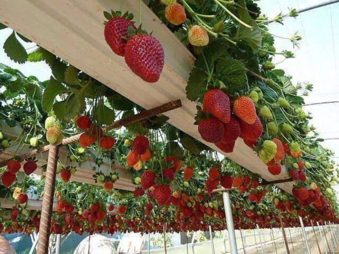 Racks are different: with hydroponics (water with a nutrient substrate and oxygen supply), earth, metal, wood, plastic, etc. The main characteristic of such a system is its convenience. Firstly, the planting area increases, and secondly, it is convenient to care for strawberries. All landings are in sight, everyone has enough heat, light and water.