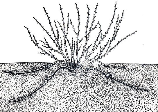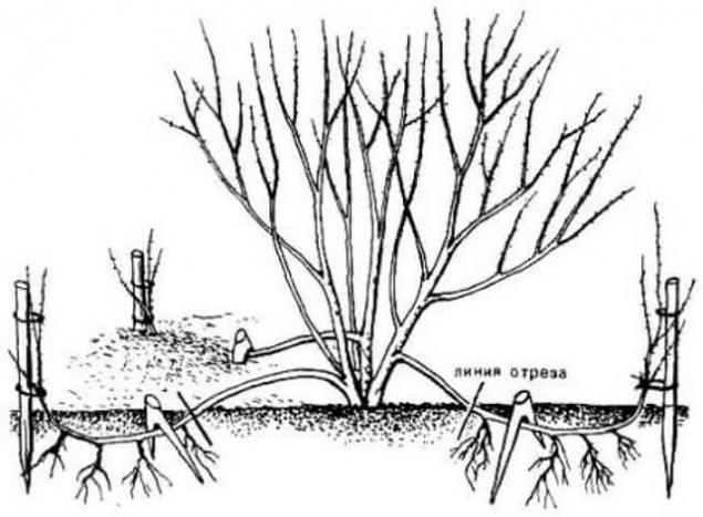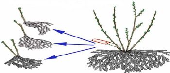 - Rooted branches are cut off from the main bush in the fall, dug up and divided into planting units, which must have their own branches. Then they are transplanted for growing.