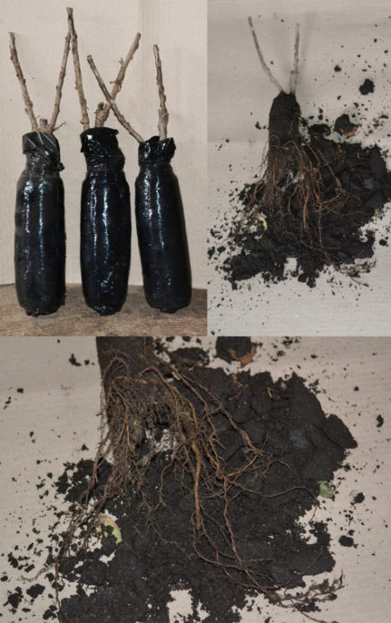 If the earthen lump is dry, it is immersed in water, which is absorbed into the ground through perforations. Roots that have grown through these holes are not removed (except for damaged ones).