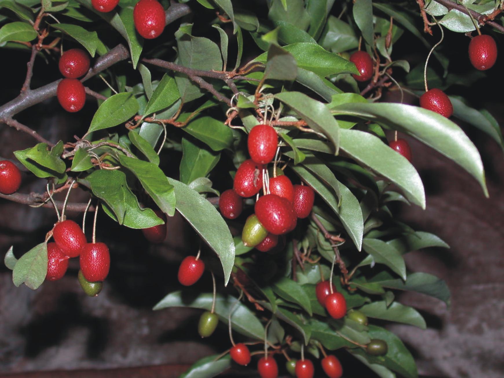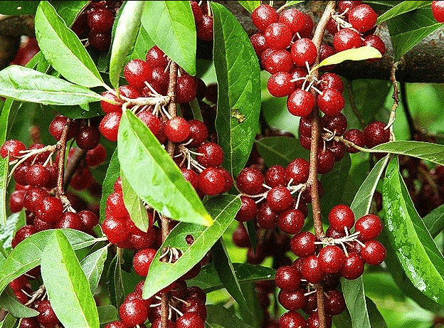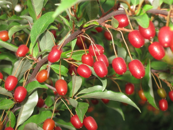 The fruits of gumi are similar to sea buckthorn berries, but are red, speckled, and hang on long stalks