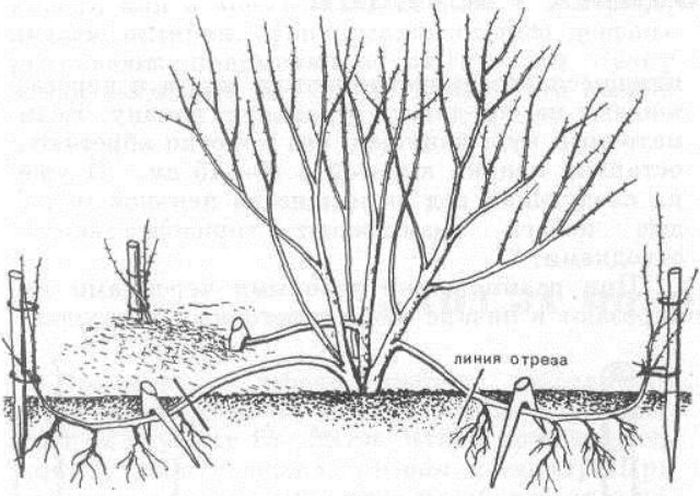 In spring, bend young flexible shoots to the ground. In those places where they touch the soil, make grooves 10–15 cm deep. Lay the shoots and dig in, the tops should remain on the surface. If the branches tend to straighten, pin them with wire or press them down with bricks. By the fall, roots will grow on the shoots, but it is better to postpone the transplant until spring.