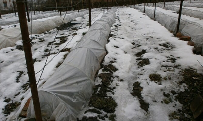 In regions with snowy winters, it is enough to tie the raspberry shoots into bunches and tilt them to the ground, having previously covered them with humus or compost. In the same regions where severe frosts are possible during a snowless winter, it is advisable to additionally cover the shrub with spunbond or film. In the spring, when the snow melts, the raspberries are lifted and tied to the trellis, after having carried out pruning.