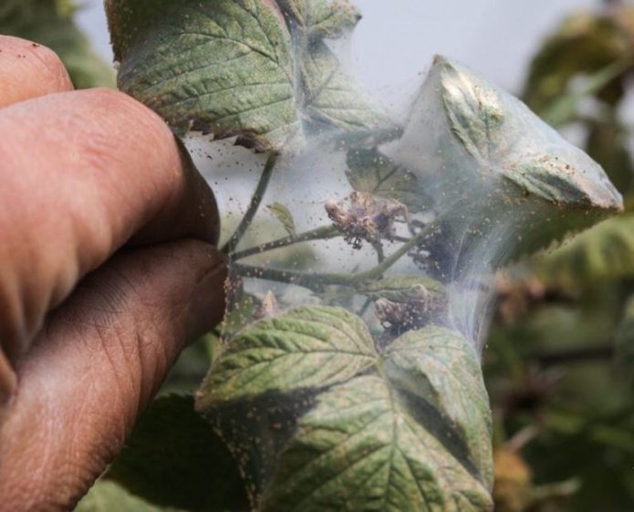 - In advanced cases, a spider mite entangles the leaves and shoots of raspberries with a cobweb, inside which there are pest nests
