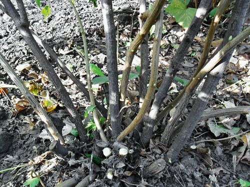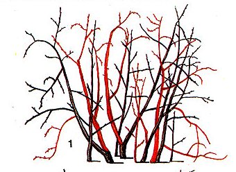 - In the fall, after leaf fall or in the spring, before the start of sap flow, first of all, take a critical look at the bush and count the number of skeletal trunks in it. Mark 7–8 of them that have a perfectly even structure and identify them with signal ribbons. Cut the rest of the trunks together with the side branches on them.