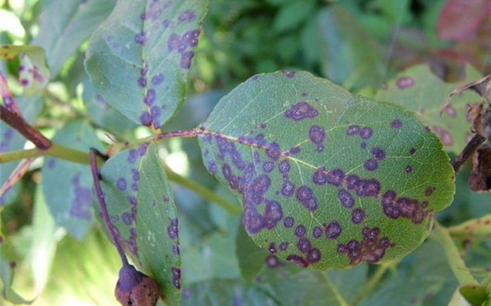 - Miscophereliosis. Almost black spots appear on the leaves, shimmering red. Blueberries look like they are splattered with mud.