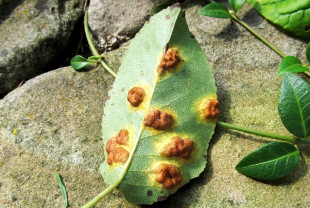 - Rust of leaves. The seamy side of the sheet plate is tightened with a "fleecy" bloom of a bright yellow-orange color; irregular bulges appear on the front side. Gradually the plaque darkens and "thickens", the affected leaves dry and die off.