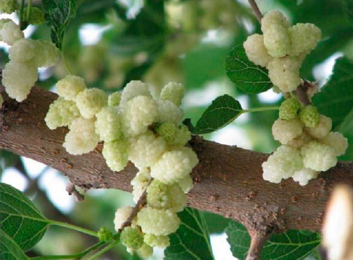 White mulberry is so named for the light color of tree trunks and branches. The fruits of this species can have different colors: white, pink, cream, black. The species is more frost-resistant than other types of mulberry, which makes it possible to grow it not only in the southern, but also in the northern regions of Russia and Ukraine. In the south, in more familiar conditions, the tree reaches a height of 10-15 m, in the north - 5 m. Fruits of a sweet taste.