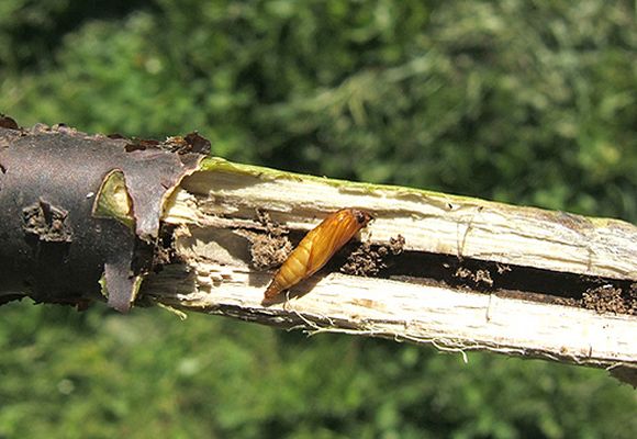 The main harm to currant bushes is caused by glassy larvae. They damage the shoots by eating away their tissues from the inside. The result is "tunnels" up to 40-50 cm long. Especially often the pest attacks old bushes. The branches become brittle and break easily. They are black when cut.