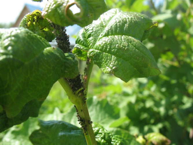 Aphids are an extremely "omnivorous" garden pest that feeds on plant sap. She attacks currant bushes en masse - whole colonies stick to the underside of young leaves, tops of shoots, flower buds and fruit ovaries. At the same time, a transparent sticky coating and a layer of black "dust" (sooty fungus) appear. The affected parts are deformed, the leaves curl, "swell", turn red, dry out quickly. Aphids live in a stable symbiosis with ants, so it will not work to get them out without getting rid of them.