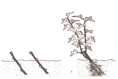 In the fall, we plant the cuttings on fertilized and well-dug beds, placing them 15–20 cm apart from each other obliquely along the row (almost 45about). We leave only 1-2 kidneys outside. Water and mulch immediately. If the weather is warm, sunny, you can shade them for the first time with newspapers or any other convenient material. This is how well-ripened cuttings look suitable for rooting.