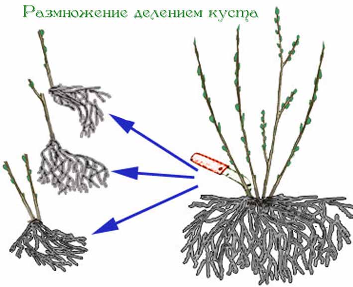 The technique of dividing a bush is completely simple. The bushes are carefully dug with a shovel and divided into parts, each of which should have two or three branches with good roots. If suddenly the division of the bush was conceived in advance, then a year before digging most of the branches can be severely cut. Then the bushes will have time to form more young shoots. But more often than not, the thought of a transplant comes suddenly, so we act as follows.