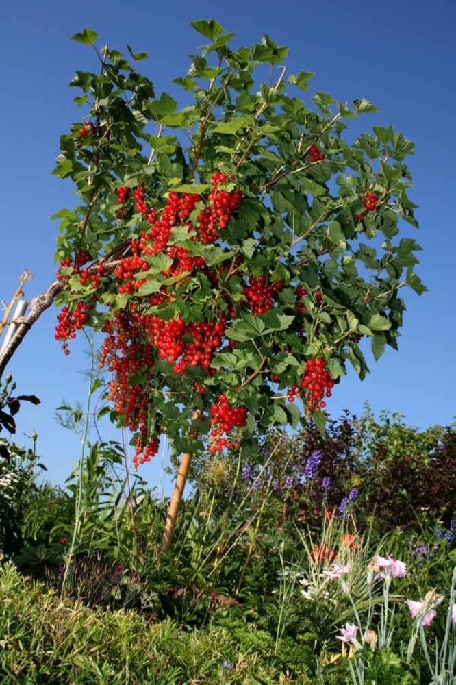 The currant on the trunk is very decorative. True, the yield is noticeably inferior to a bush of the same variety with conventional pruning. But there are more berries in the cluster, the clusters themselves are longer, and the berries are larger and sweeter.