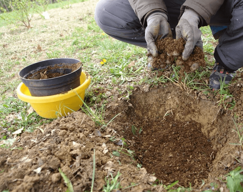 - So much soil is taken out of the planting pit so that the seedling can easily be located in it, and they form a kind of mound on which the seedling is freely placed so that the roots do not bend in an unnatural way.