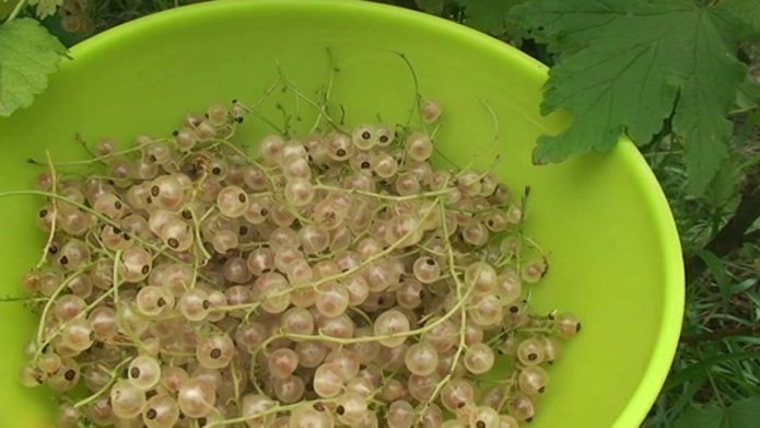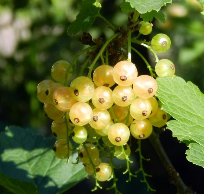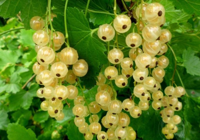 White currant is a type of red. Milk to cream colored berries, sweeter than red or black. Does not cause allergic reactions. Has a delicate aroma. The yield is high. The berries stay on the branches for a long time. Dislikes highly moist soils. In sunny areas it bears fruit better, and in the shade the berries grow more acidic.