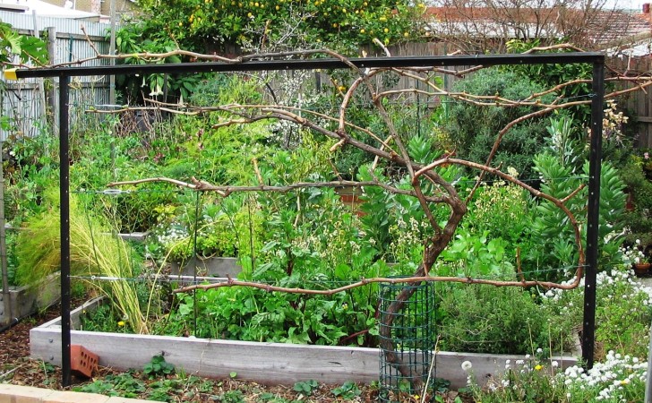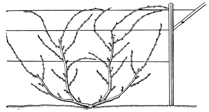 Young green shoots that appear in summer are tied to the third and fourth tier of the trellis.