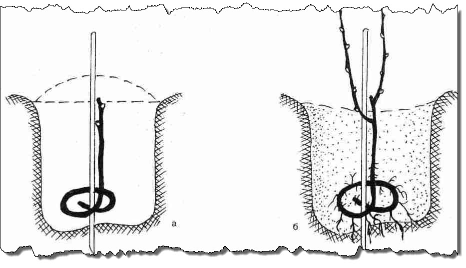 There is an ancient Moldovan way of planting grapes. For him, in the spring, a vine is taken (ripe, but flexible, not too thick) with a length of 60 to 200 cm. It is twisted several times in a ring, fixed with a rope. Then the ring is placed in a pit to a depth of 15–20 cm (in some sources 40–50 cm) so that one or two buds are visible on the surface. A hill of earth is poured over the end of the vines to retain moisture. The ground around is covered with mulch.