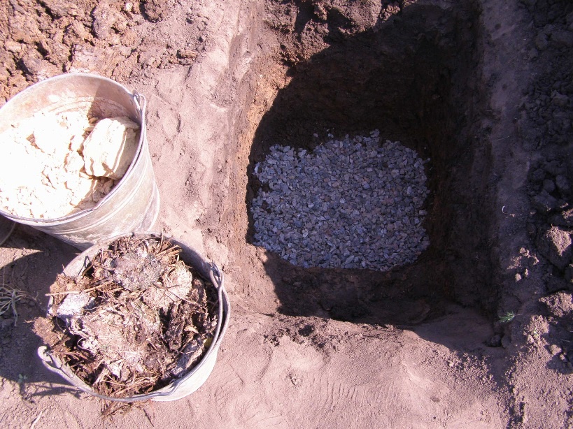 You need to fill the pit gradually, spilling the mixture with water several times and slightly compacting. If you are preparing a pit in the spring, then spill it with hot water (at least a bucket on the pit). The pit should not be completely filled up; it should be 20–25 cm below ground level.