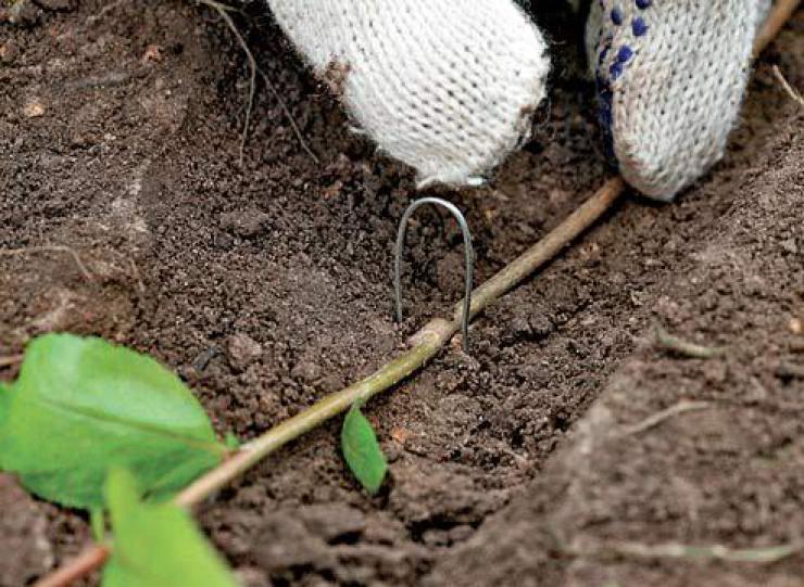 - In spring, the shoots are placed in grooves 25–30 cm deep, pre-fertilized, and fixed with wire hooks.
