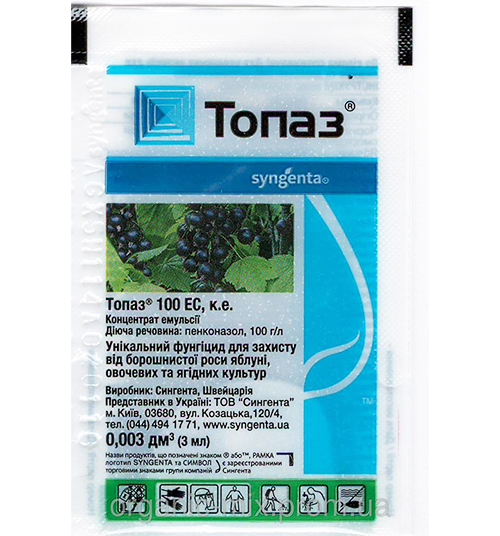 | Topaz | The entire growing season, except for the ripening of berries. | oidium | absorbed in 30 minutes; can be mixed with other preparations. |