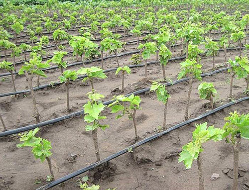 It is believed that grapes growing on poor soils without drip irrigation will have weak and thin vines. For this reason, bushes can be planted much thicker than on fertile land with regular watering.