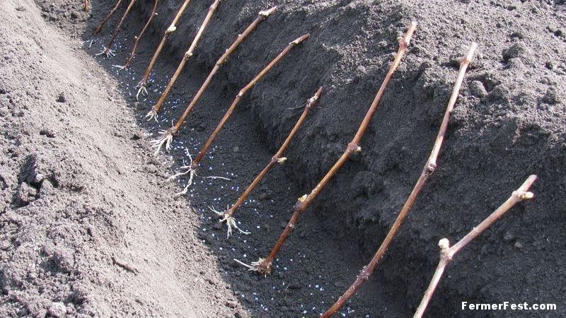 - Set the cuttings along one of the groove walls at a distance of 12-15 cm from each other and so that 1-2 eyes of the cuttings remain above the soil surface.