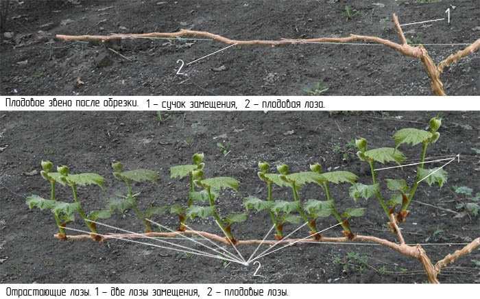 Shown is one of the grape sleeves (fruit link); green shoots growing vertically upward are fruitful, they will have clusters